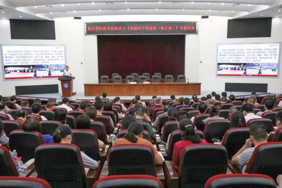 为推动学习贯彻习近平新时代中国特色社会主义思想主题教育走深走实,引导广大党员深刻理解把握党章修改的核心内容和重大意义,5月19日上午,机关党委在国际会议中心举办学习《中国共产党章程(修正案)》专题辅导,邀请学习贯彻党的二十大精神市委宣讲团成员、马克思主义学院李学明副教授作专题报告。讲座由机关党委书记程洁如主持,机关各支部党员、发展对象、入党积极分子近200人参加了会议。