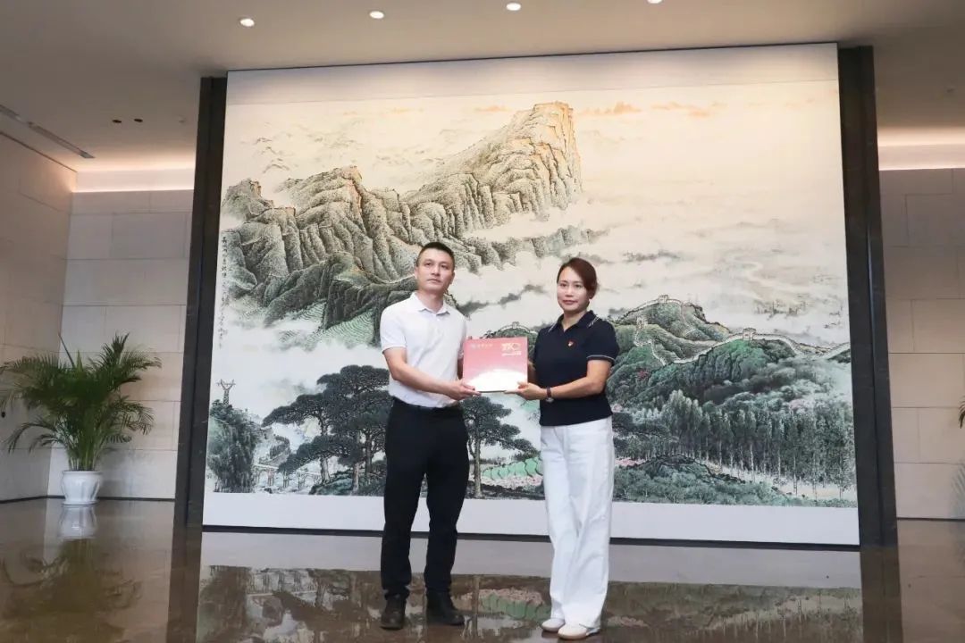 图(我校副校长张丽霞和中国国家版本馆广州分馆办公室主任黄磊互赠纪念册)