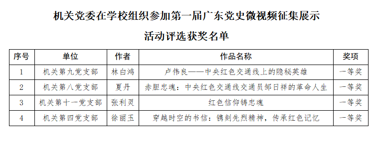 近日,学校公布了第一届广东党史微视频征集展示活动校内评选结果,机关党委推荐的4部作品,全部获一等奖,获奖率100%!