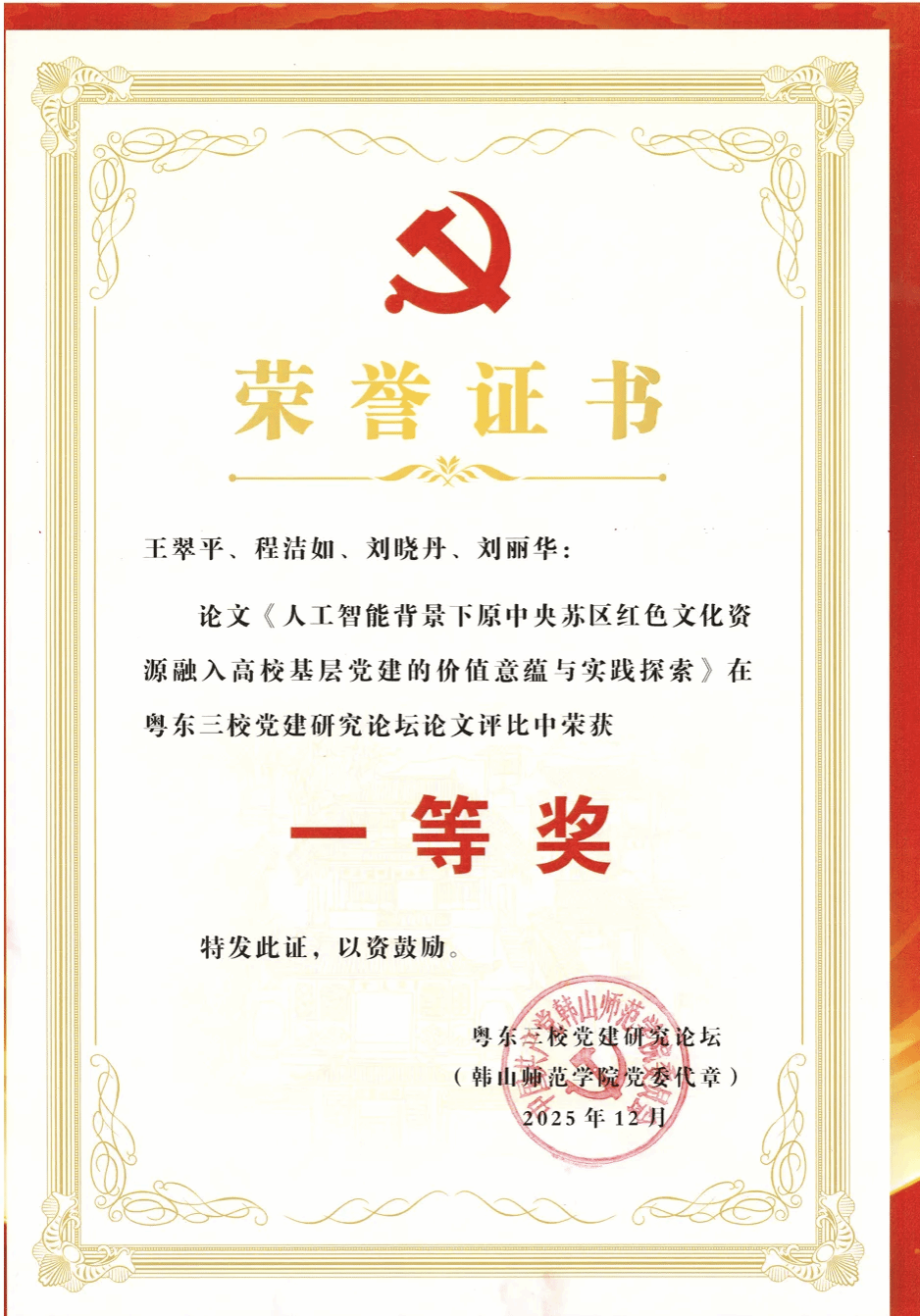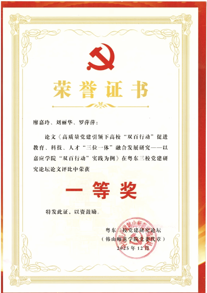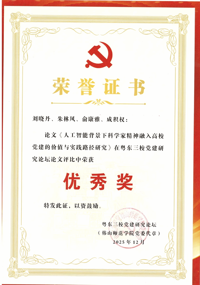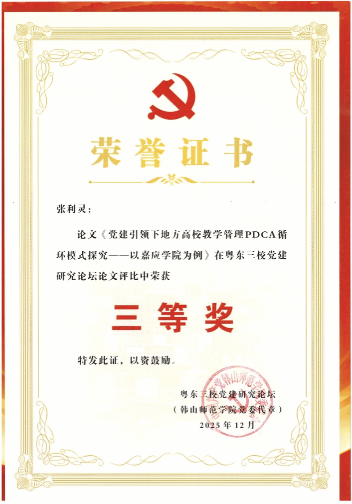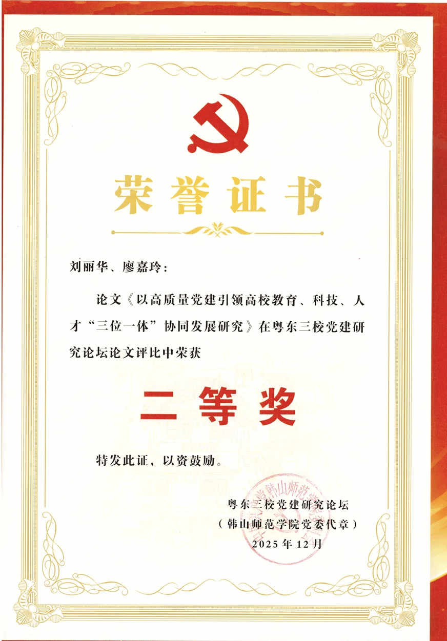 近日,2025年粤东三校党建研究论坛公布了论文评选结果。经专家组匿名评审,我校共有30篇论文获奖,机关党委喜获5项荣誉,包括一等奖2篇、二等奖1篇、三等奖1篇、优秀奖1篇,其中,一等奖论文《人工智能背景下原中央苏区红色文化资源融入高校基层党建的价值意蕴与实践探索》作者代表刘丽华在主论坛作成果分享和机关党建实践经验介绍,展现了我校机关党建的工作成效。