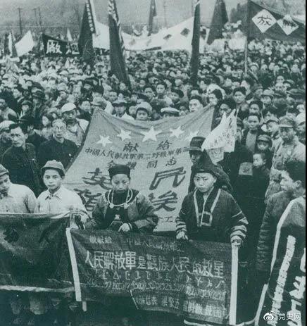 1949年11月15日,贵州解放。图为苗族同胞向人民解放军部队献旗。