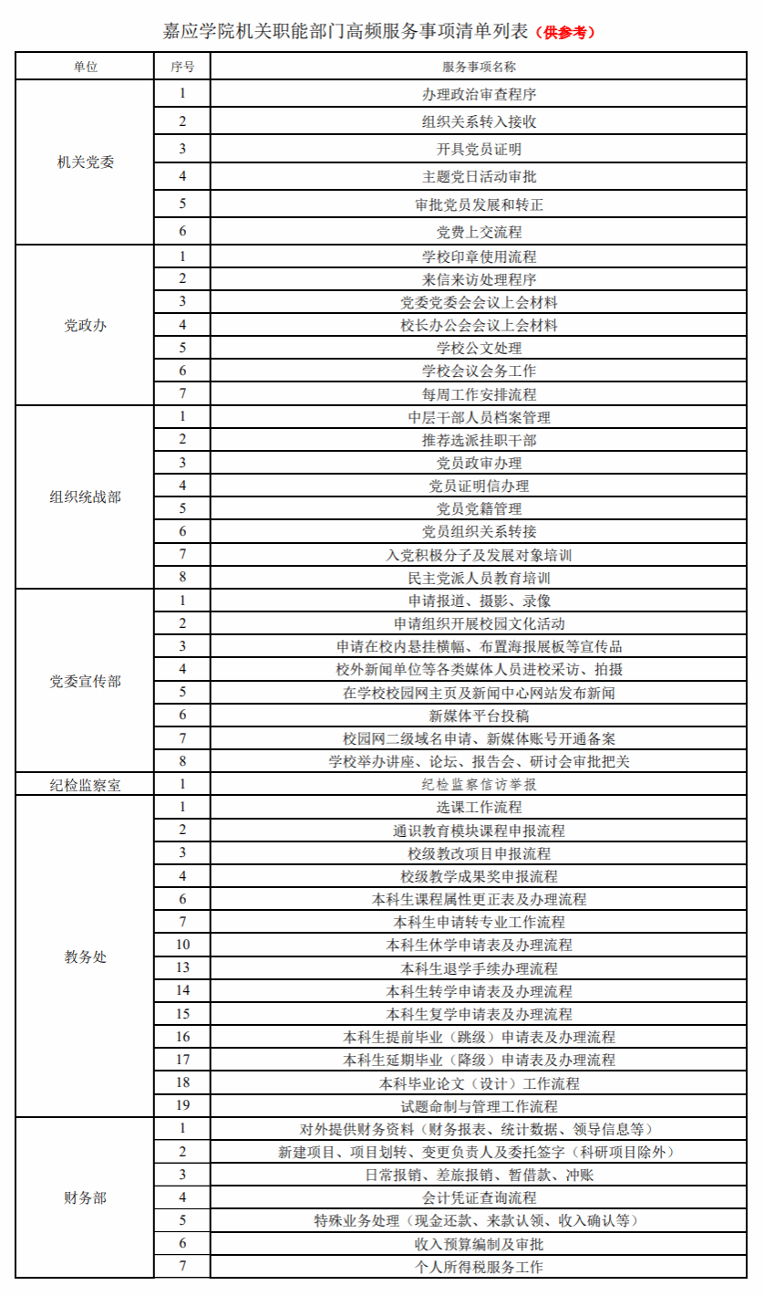 嘉应学院机关职能部门高频服务事项清单列表(供参考)